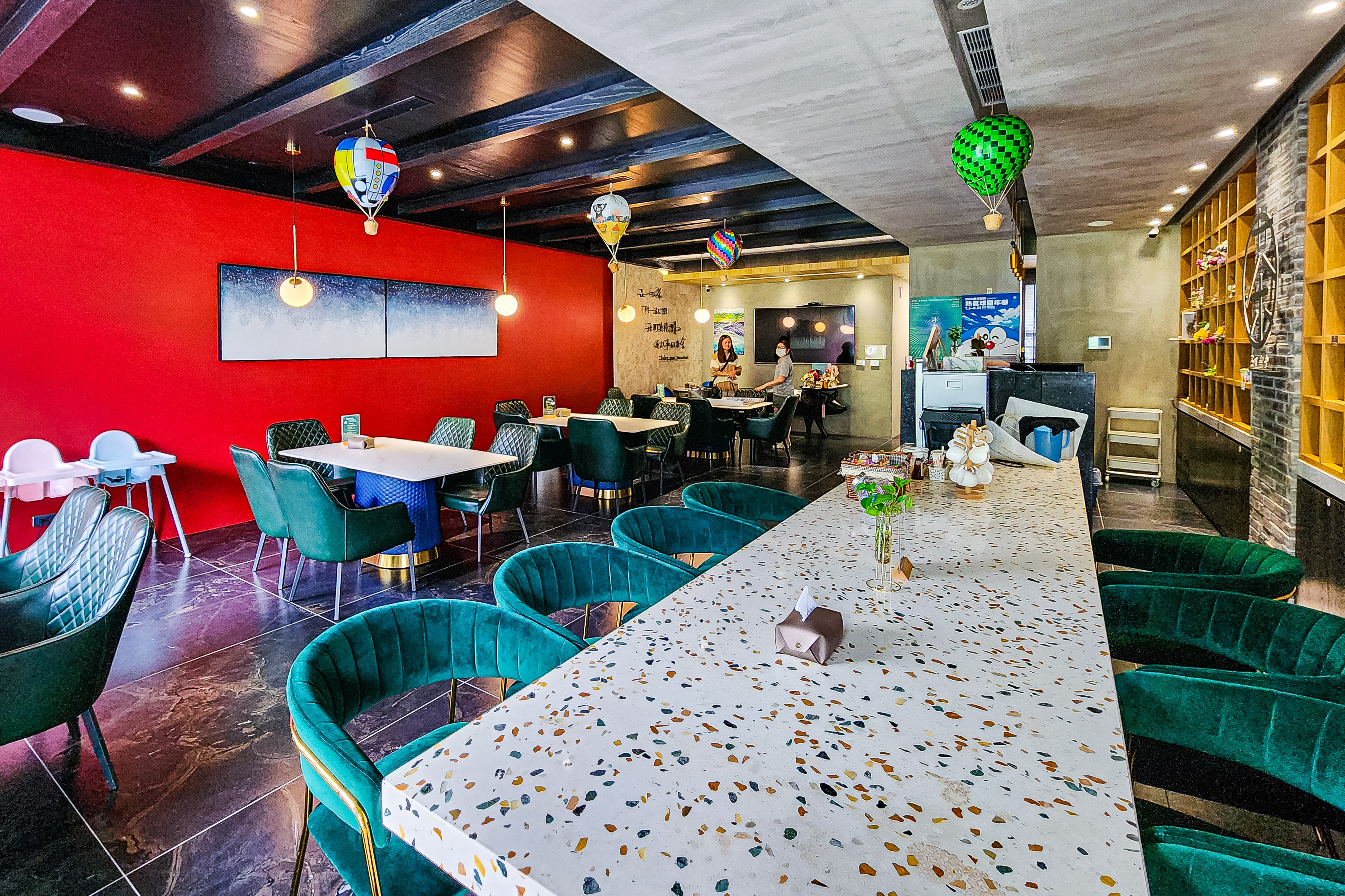 大廳空間提供桌椅、閱讀區、用餐區,並設置咖啡機、沖泡飲品、自家茶園茶包、餅乾點心、泡麵等免費取用。