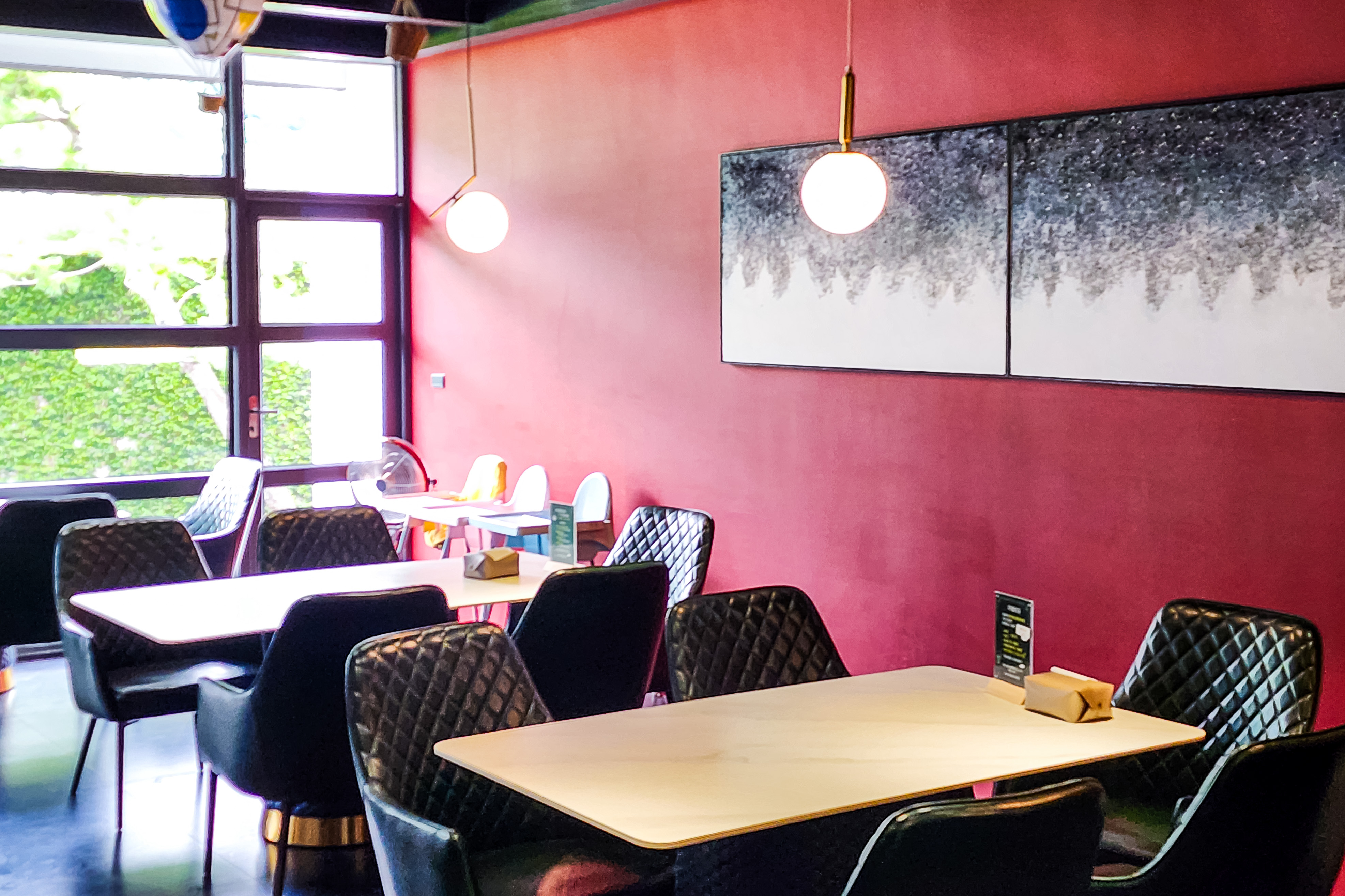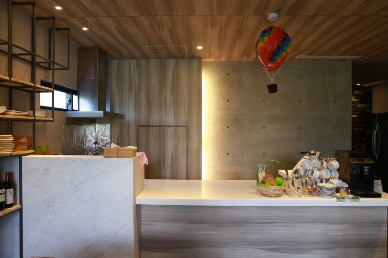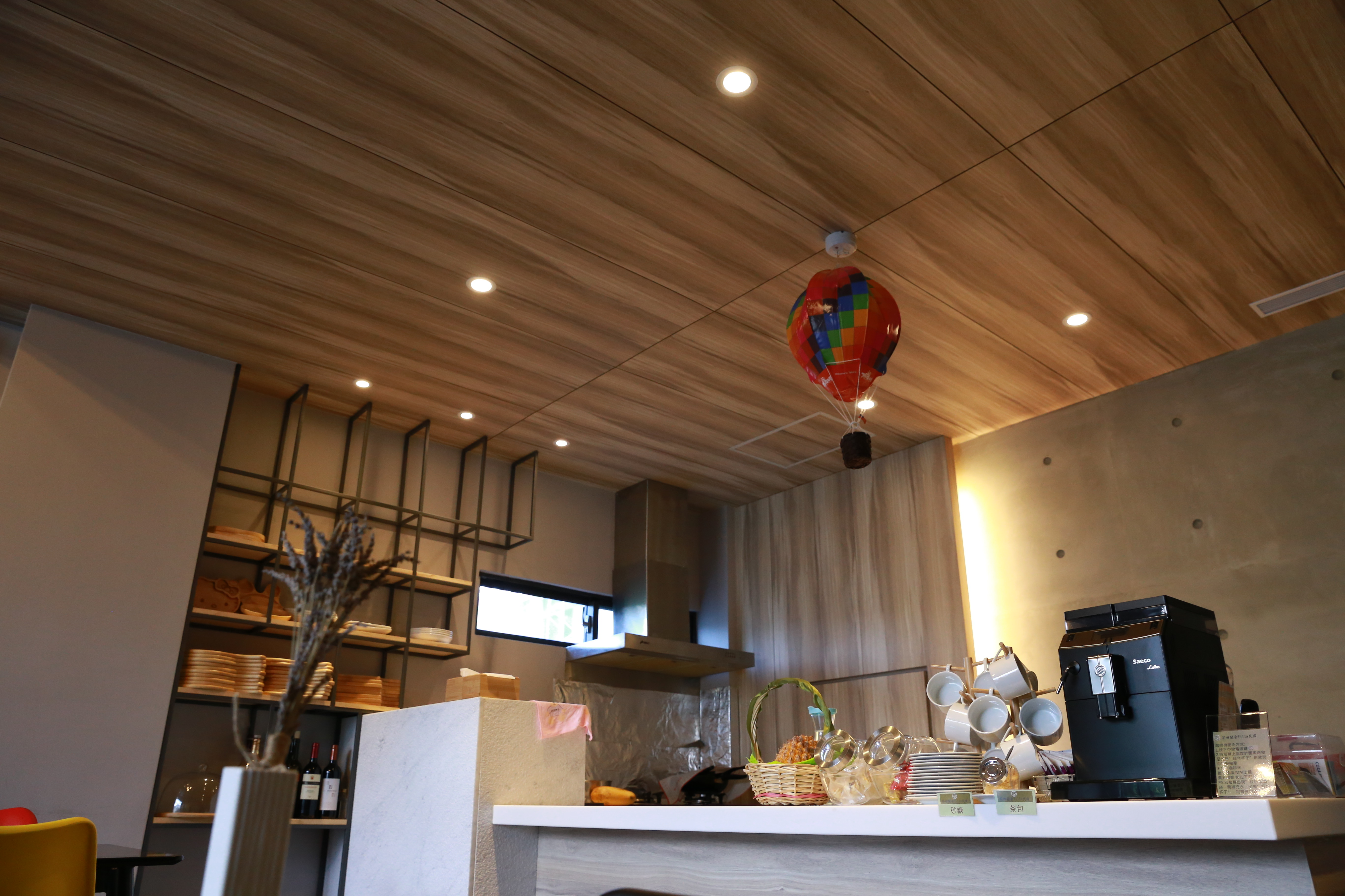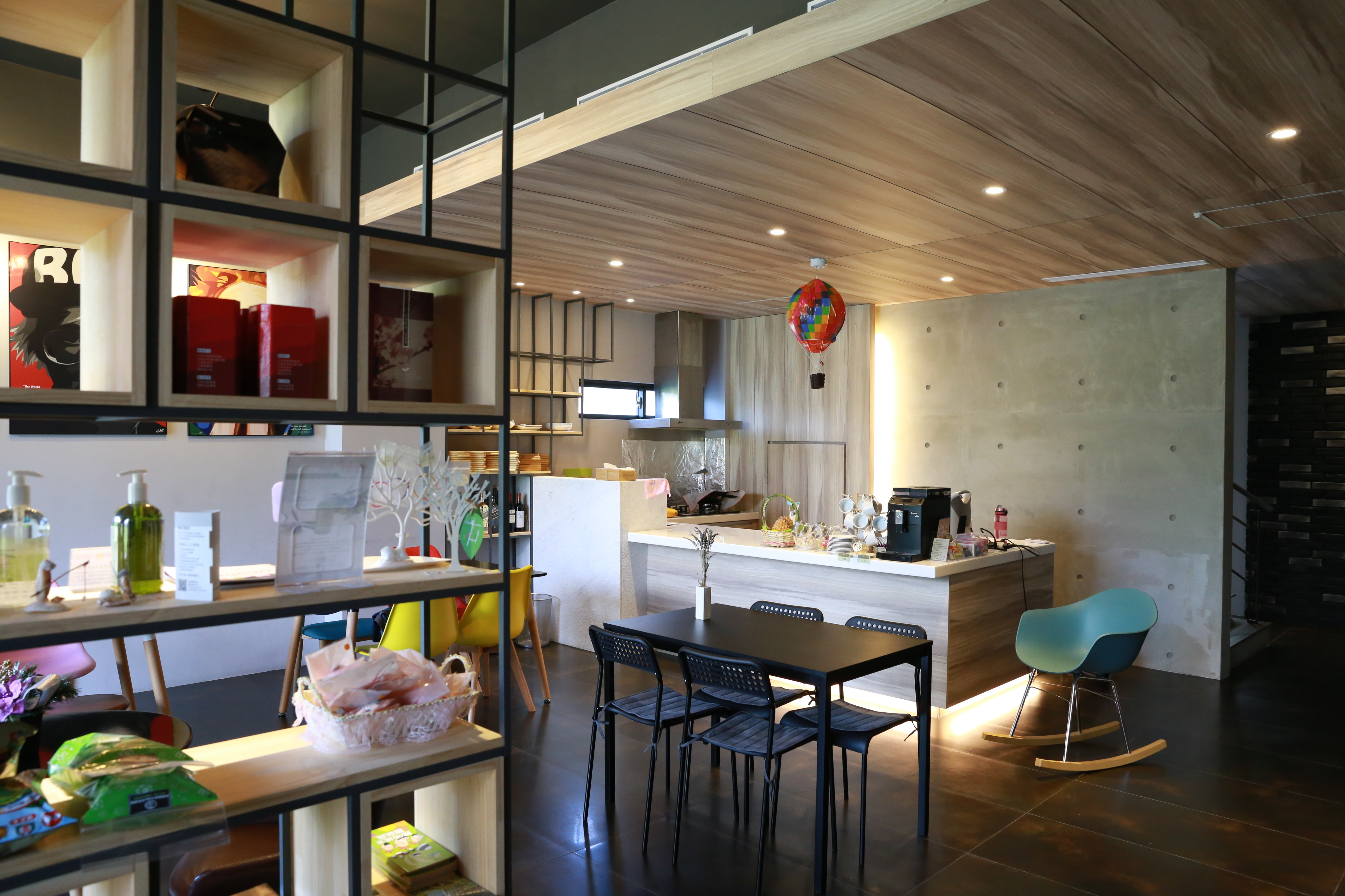 大廳空間提供桌椅、閱讀區、用餐區,並設置咖啡機、沖泡飲品、自家茶園茶包、餅乾點心、泡麵等免費取用。